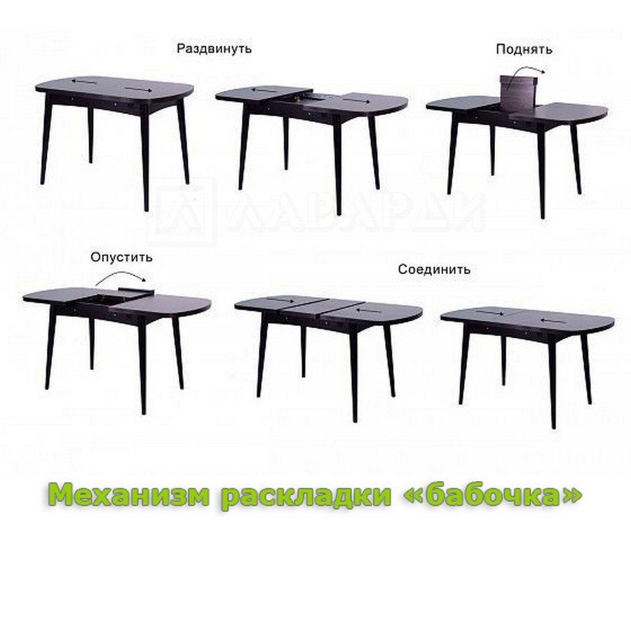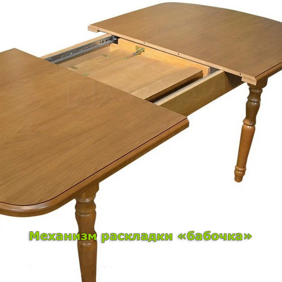 Механизм трансформации столешницы - синхронный, механизм трансформации вставки -тип «Бабочка». Вставка состоит из 2х частей на петлях. Складывает пополам в нишу под столом, где и хранится.