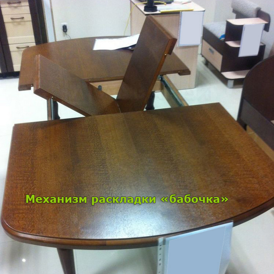 Механизм трансформации столешницы - синхронный, механизм трансформации вставки -тип «Бабочка». Вставка состоит из 2х частей на петлях. Складывает пополам в нишу под столом, где и хранится.